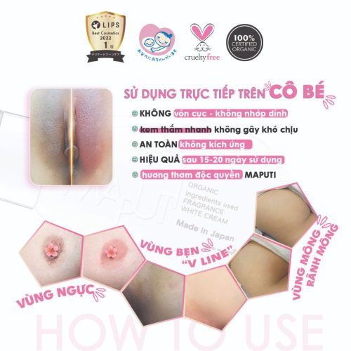 Kem trị thâm vùng kín Maputi White Cream đạt giải thưởng Top 1 Kem trị thâm vùng da nhạy cảm hữu cơ liên tiếp trong 2 năm (2022-2023) tại Nhật do LIPS (Nền tảng làm đẹp và mỹ phẩm lớn nhất Nhật Bản tại công bố hàng năm).